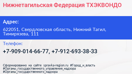 Нижнетагильская Федерация ТХЭКВОНДО по адресу 622051, Свердловская область, Нижний Тагил, Тимирязева, 111 в дальнейшем Организация, размещена в следующих категориях: