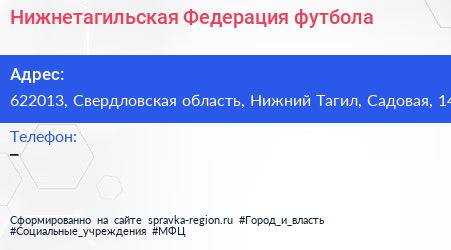 Нижнетагильская Федерация футбола по адресу 622013, Свердловская область, Нижний Тагил, Садовая, 14 в дальнейшем Организация, размещена в следующих категориях: