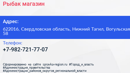 Рыбак, магазин по адресу 622016, Свердловская область, Нижний Тагил, Вогульская, 58 в дальнейшем Организация, размещена в следующих категориях: