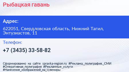 Рыбацкая гавань по адресу 622051, Свердловская область, Нижний Тагил, Энтузиастов, 11 в дальнейшем Организация, размещена в следующих категориях: