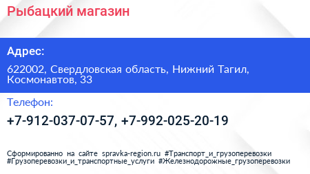 Рыбацкий, магазин по адресу 622002, Свердловская область, Нижний Тагил, Космонавтов, 33 в дальнейшем Организация, размещена в следующих категориях: