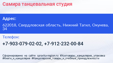 Самира, танцевальная студия по адресу 622018, Свердловская область, Нижний Тагил, Окунева, 34 в дальнейшем Организация, размещена в следующих категориях: