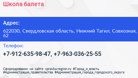 Школа балета по адресу 622030, Свердловская область, Нижний Тагил, Совхозная, 62 в дальнейшем Организация, размещена в следующих категориях: