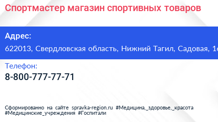 Спортмастер, магазин спортивных товаров по адресу 622013, Свердловская область, Нижний Тагил, Садовая, 16 в дальнейшем Организация, размещена в следующих категориях: