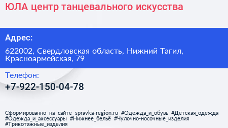 ЮЛА, центр танцевального искусства по адресу 622002, Свердловская область, Нижний Тагил, Красноармейская, 79 в дальнейшем Организация, размещена в следующих категориях: