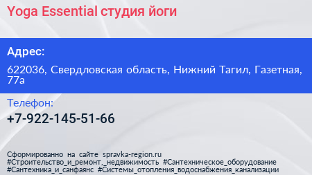 Yoga Essential, студия йоги по адресу 622036, Свердловская область, Нижний Тагил, Газетная, 77а в дальнейшем Организация, размещена в следующих категориях: