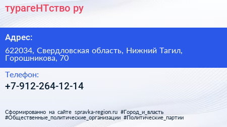 турагеНТство.ру по адресу 622034, Свердловская область, Нижний Тагил, Горошникова, 70 в дальнейшем Организация, размещена в следующих категориях: