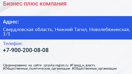 Бизнес плюс, компания по адресу Свердловская область, Нижний Тагил, Новолебяжинская, 1/1 в дальнейшем Организация, размещена в следующих категориях: