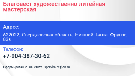 Благовест, художественно-литейная мастерская по адресу 622022, Свердловская область, Нижний Тагил, Фрунзе, 83в в дальнейшем Организация, размещена в следующих категориях: