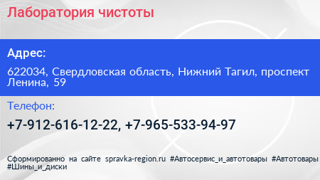 Лаборатория чистоты по адресу 622034, Свердловская область, Нижний Тагил, проспект Ленина, 59 в дальнейшем Организация, размещена в следующих категориях: