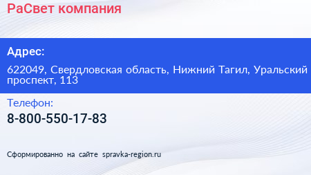 РаСвет, компания по адресу 622049, Свердловская область, Нижний Тагил, Уральский проспект, 113 в дальнейшем Организация, размещена в следующих категориях: