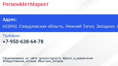 РегионМетМаркет по адресу 622042, Свердловская область, Нижний Тагил, Западная, 6 в дальнейшем Организация, размещена в следующих категориях: