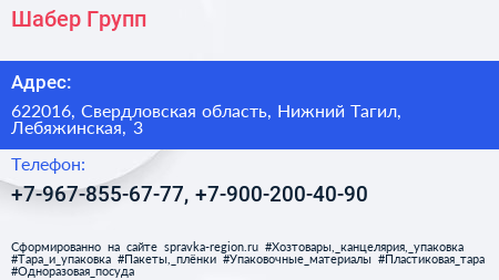 Шабер Групп по адресу 622016, Свердловская область, Нижний Тагил, Лебяжинская, 3 в дальнейшем Организация, размещена в следующих категориях: