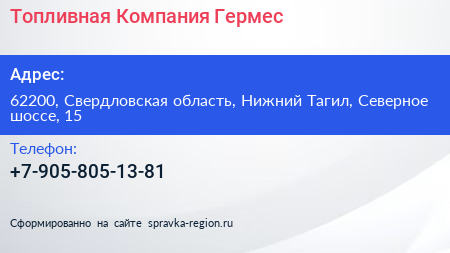 Топливная Компания Гермес по адресу 62200, Свердловская область, Нижний Тагил, Северное шоссе, 15 в дальнейшем Организация, размещена в следующих категориях:
