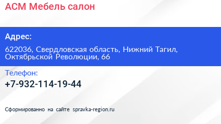 АСМ Мебель, салон по адресу 622036, Свердловская область, Нижний Тагил, Октябрьской Революции, 66 в дальнейшем Организация, размещена в следующих категориях: