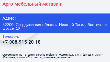 Арго, мебельный магазин по адресу 62200, Свердловская область, Нижний Тагил, Восточное шоссе, 19 в дальнейшем Организация, размещена в следующих категориях: