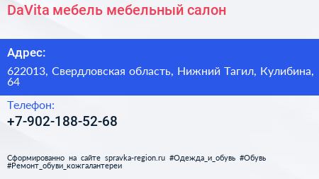 DaVita-мебель, мебельный салон по адресу 622013, Свердловская область, Нижний Тагил, Кулибина, 64 в дальнейшем Организация, размещена в следующих категориях: