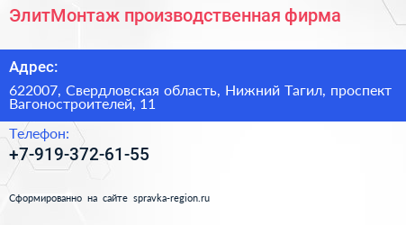 ЭлитМонтаж, производственная фирма по адресу 622007, Свердловская область, Нижний Тагил, проспект Вагоностроителей, 11 в дальнейшем Организация, размещена в следующих категориях: