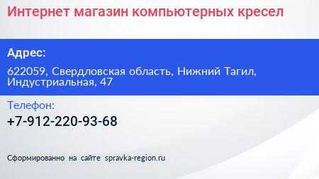 Интернет-магазин компьютерных кресел по адресу 622059, Свердловская область, Нижний Тагил, Индустриальная, 47 в дальнейшем Организация, размещена в следующих категориях: