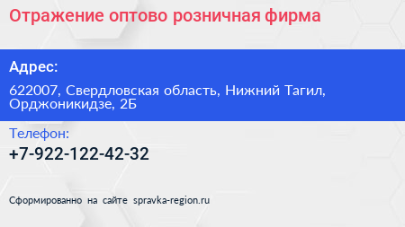 Отражение, оптово-розничная фирма по адресу 622007, Свердловская область, Нижний Тагил, Орджоникидзе, 2Б в дальнейшем Организация, размещена в следующих категориях: