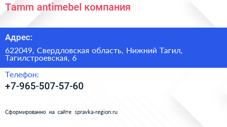 Tamm`antimebel, компания по адресу 622049, Свердловская область, Нижний Тагил, Тагилстроевская, 6 в дальнейшем Организация, размещена в следующих категориях: