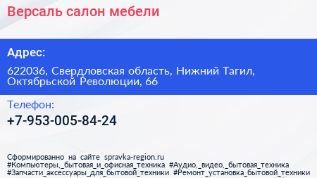 Версаль, салон мебели по адресу 622036, Свердловская область, Нижний Тагил, Октябрьской Революции, 66 в дальнейшем Организация, размещена в следующих категориях: