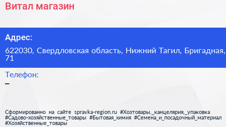 Витал, магазин по адресу 622030, Свердловская область, Нижний Тагил, Бригадная, 71 в дальнейшем Организация, размещена в следующих категориях: