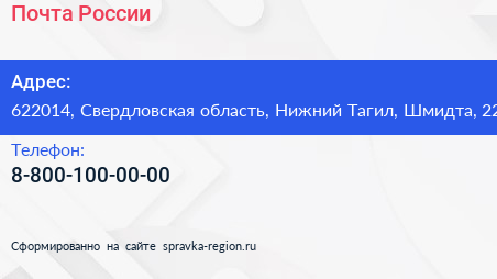 Почта России по адресу 622014, Свердловская область, Нижний Тагил, Шмидта, 22 в дальнейшем Организация, размещена в следующих категориях: