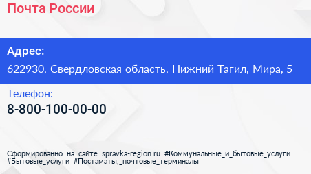 Почта России по адресу 622930, Свердловская область, Нижний Тагил, Мира, 5 в дальнейшем Организация, размещена в следующих категориях: