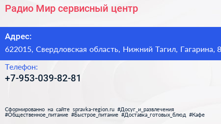 Радио Мир, сервисный центр по адресу 622015, Свердловская область, Нижний Тагил, Гагарина, 8 в дальнейшем Организация, размещена в следующих категориях: