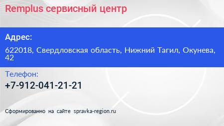 Remplus, сервисный центр по адресу 622018, Свердловская область, Нижний Тагил, Окунева, 42 в дальнейшем Организация, размещена в следующих категориях: