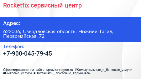 Rocketfix, сервисный центр по адресу 622036, Свердловская область, Нижний Тагил, Первомайская, 72 в дальнейшем Организация, размещена в следующих категориях: