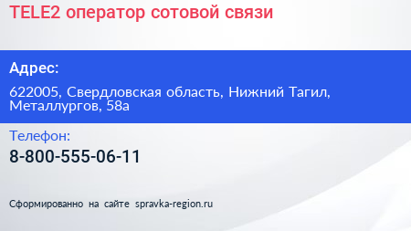 TELE2, оператор сотовой связи по адресу 622005, Свердловская область, Нижний Тагил, Металлургов, 58а в дальнейшем Организация, размещена в следующих категориях: