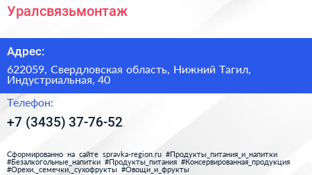 Уралсвязьмонтаж по адресу 622059, Свердловская область, Нижний Тагил, Индустриальная, 40 в дальнейшем Организация, размещена в следующих категориях: