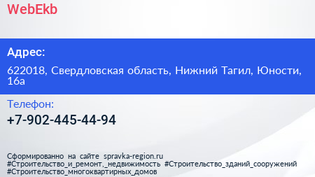 WebEkb по адресу 622018, Свердловская область, Нижний Тагил, Юности, 16а в дальнейшем Организация, размещена в следующих категориях: