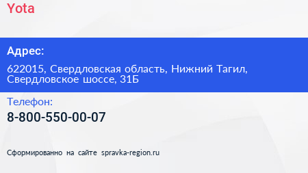 Yota по адресу 622015, Свердловская область, Нижний Тагил, Свердловское шоссе, 31Б в дальнейшем Организация, размещена в следующих категориях: