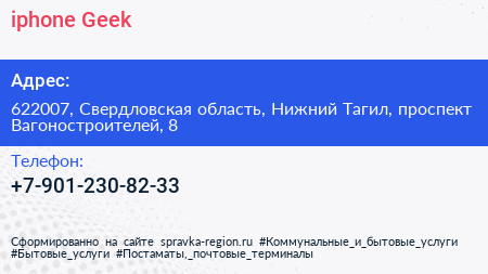 iphone Geek по адресу 622007, Свердловская область, Нижний Тагил, проспект Вагоностроителей, 8 в дальнейшем Организация, размещена в следующих категориях: