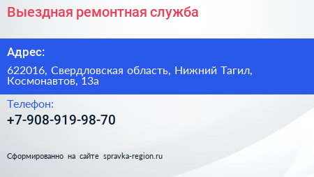 Выездная ремонтная служба по адресу 622016, Свердловская область, Нижний Тагил, Космонавтов, 13а в дальнейшем Организация, размещена в следующих категориях: