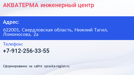 АКВАТЕРМА, инженерный центр по адресу 622001, Свердловская область, Нижний Тагил, Ломоносова, 2а в дальнейшем Организация, размещена в следующих категориях: