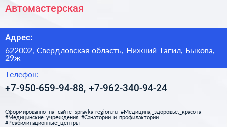Автомастерская по адресу 622002, Свердловская область, Нижний Тагил, Быкова, 29ж в дальнейшем Организация, размещена в следующих категориях: