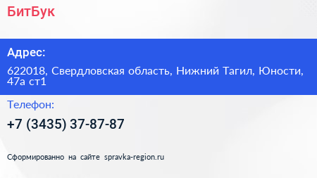 БитБук по адресу 622018, Свердловская область, Нижний Тагил, Юности, 47а ст1 в дальнейшем Организация, размещена в следующих категориях: