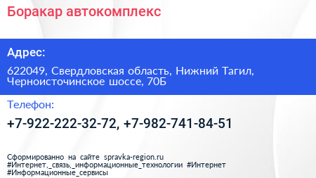 Боракар, автокомплекс по адресу 622049, Свердловская область, Нижний Тагил, Черноисточинское шоссе, 70Б в дальнейшем Организация, размещена в следующих категориях:
