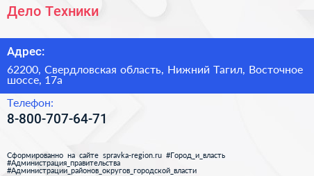 Дело Техники по адресу 62200, Свердловская область, Нижний Тагил, Восточное шоссе, 17а в дальнейшем Организация, размещена в следующих категориях: