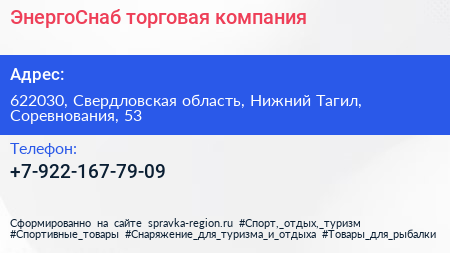 ЭнергоСнаб, торговая компания по адресу 622030, Свердловская область, Нижний Тагил, Соревнования, 53 в дальнейшем Организация, размещена в следующих категориях:
