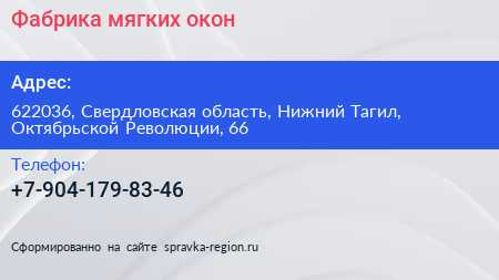 Фабрика мягких окон по адресу 622036, Свердловская область, Нижний Тагил, Октябрьской Революции, 66 в дальнейшем Организация, размещена в следующих категориях:
