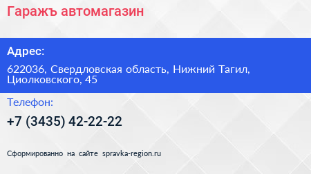Гаражъ, автомагазин по адресу 622036, Свердловская область, Нижний Тагил, Циолковского, 45 в дальнейшем Организация, размещена в следующих категориях: