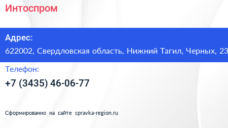 Интоспром по адресу 622002, Свердловская область, Нижний Тагил, Черных, 23 в дальнейшем Организация, размещена в следующих категориях: