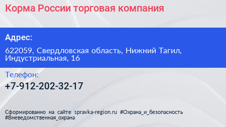Корма России, торговая компания по адресу 622059, Свердловская область, Нижний Тагил, Индустриальная, 16 в дальнейшем Организация, размещена в следующих категориях: