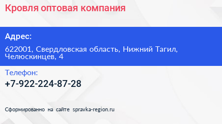 Кровля, оптовая компания по адресу 622001, Свердловская область, Нижний Тагил, Челюскинцев, 4 в дальнейшем Организация, размещена в следующих категориях: