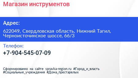 Магазин инструментов по адресу 622049, Свердловская область, Нижний Тагил, Черноисточинское шоссе, 66/3 в дальнейшем Организация, размещена в следующих категориях: